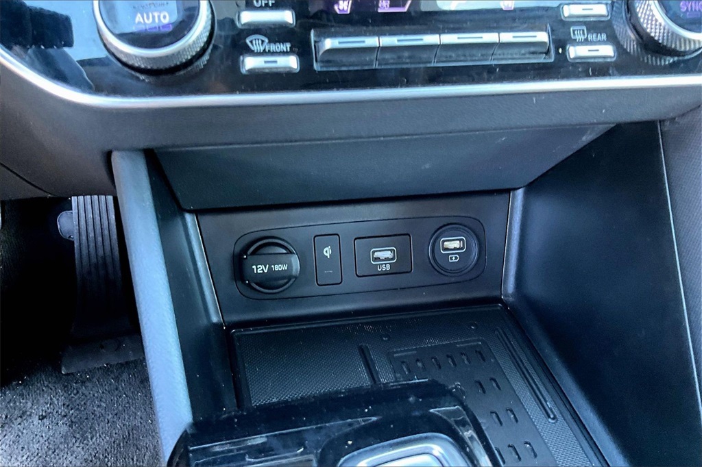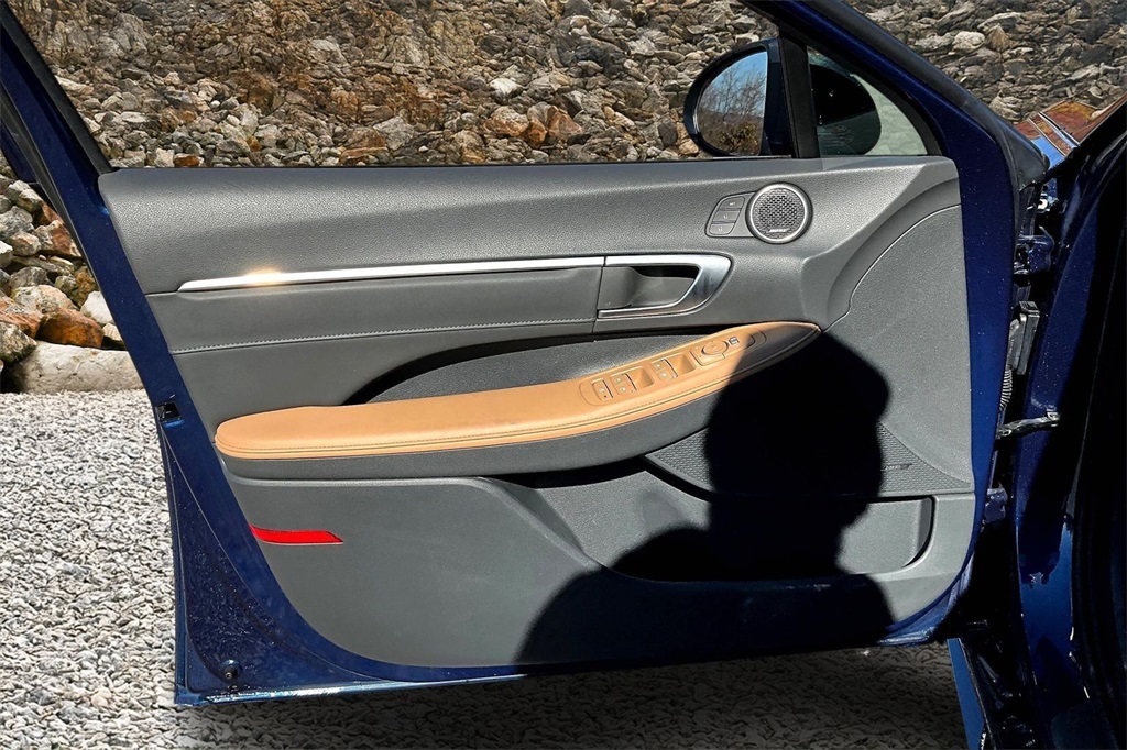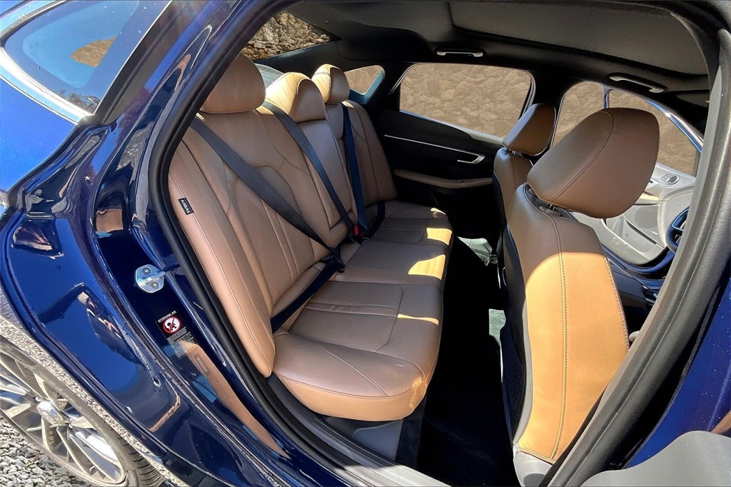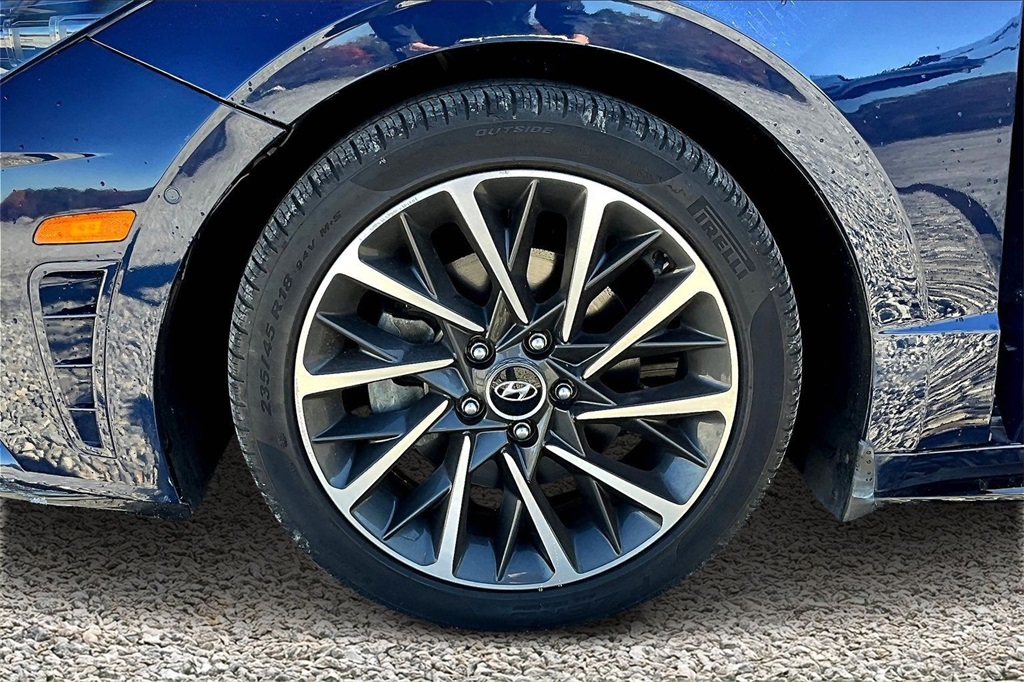 | Navigation System | | Blue Link Connected Care & Remote Package | | Option Group 01 | | 12 Speakers | | AM/FM radio: SiriusXM | | Bose Premium Audio | | Radio data system | | Radio: AM/FM/MP3/HD/SiriusXM Display Audio w/Nav | | Air Conditioning | | Automatic temperature control | | Front dual zone A/C | | Rear window defroster | | Heads-Up Display | | Memory seat | | Power driver seat | | Power steering | | Power windows | | Remote keyless entry | | Steering wheel mounted audio controls | | Four wheel independent suspension | | Speed-sensing steering | | Traction control | | 4-Wheel Disc Brakes | | ABS brakes | | Dual front impact airbags | | Dual front side impact airbags | | Emergency communication system: Blue Link Connected Care (3-year subscription) | | Front anti-roll bar | | Knee airbag | | Low tire pressure warning | | Occupant sensing airbag | | Overhead airbag | | Rear anti-roll bar | | Rear side impact airbag | | Power moonroof | | Brake assist | | Electronic Stability Control | | Auto High-beam Headlights | | Delay-off headlights | | Fully automatic headlights | | Panic alarm | | Security system | | Speed control | | Bumpers: body-color | | Heated door mirrors | | Mud Guards | | Power door mirrors | | Rear Bumper Applique | | Turn signal indicator mirrors | | Apple CarPlay & Android Auto | | Auto-dimming Rear-View mirror | | Carpeted Floor Mats | | Driver door bin | | Driver vanity mirror | | Front reading lights | | Garage door transmitter: HomeLink | | Heated steering wheel | | Heated/Ventilated Front Bucket Seats | | Illuminated entry | | Outside temperature display | | Overhead console | | Passenger vanity mirror | | Rear seat center armrest | | Tachometer | | Telescoping steering wheel | | Tilt steering wheel | | Trip computer | | Wireless Phone Charging | | Front Bucket Seats | | Front Center Armrest | | Heated front seats | | Leather Seating Surfaces | | Power passenger seat | | Split folding rear seat | | Ventilated front seats | | Passenger door bin | | Alloy wheels | | Wheels: 18 x 7.5J Machine/Argent Finish Alum Alloy | | Rain sensing wipers | | Speed-Sensitive Wipers | | Variably intermittent wipers | | Fresh oil change |