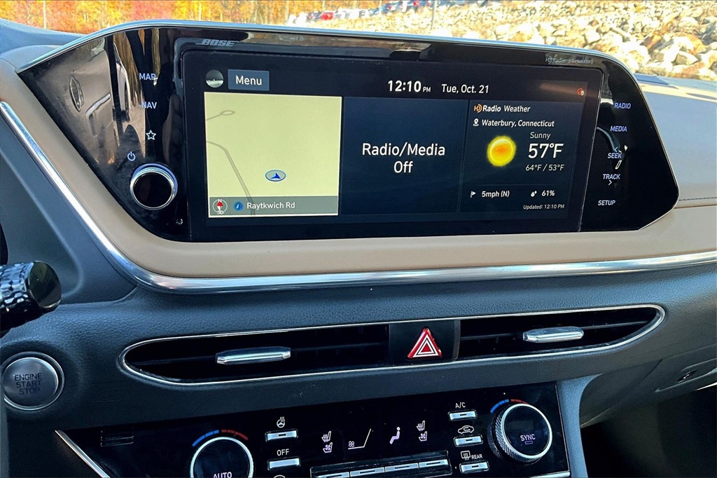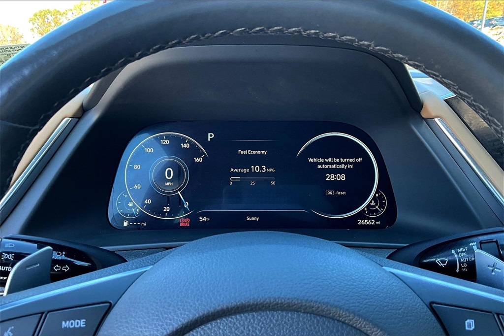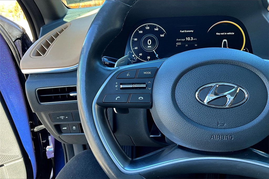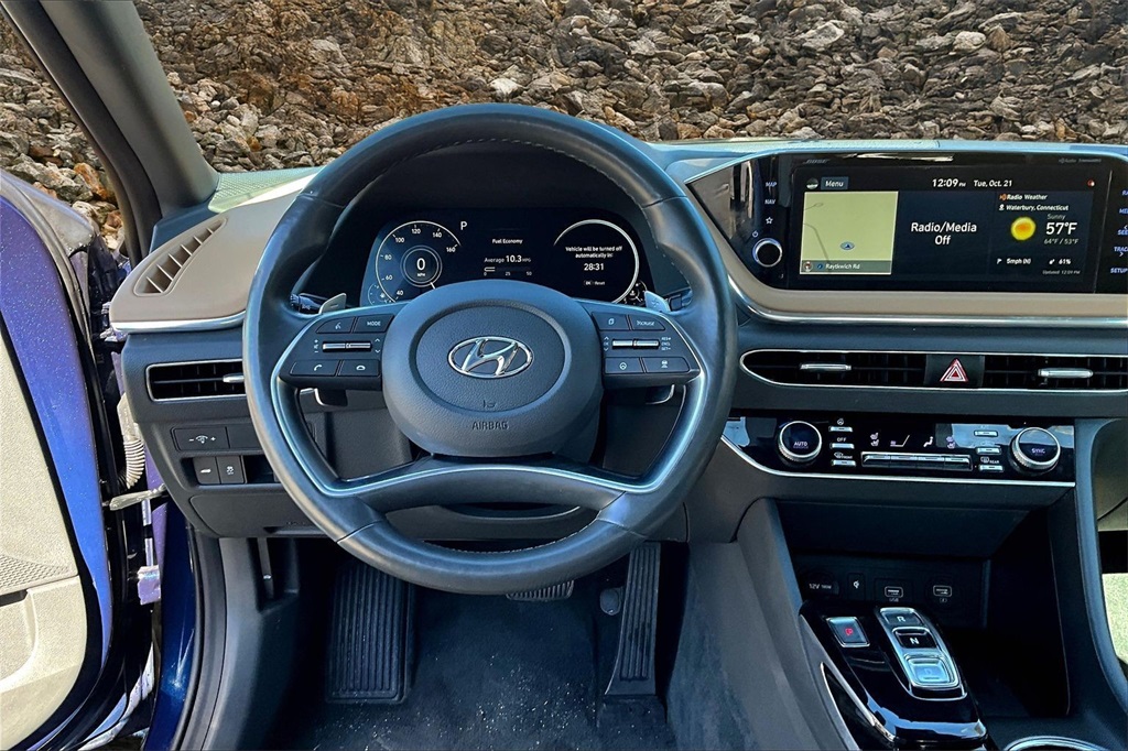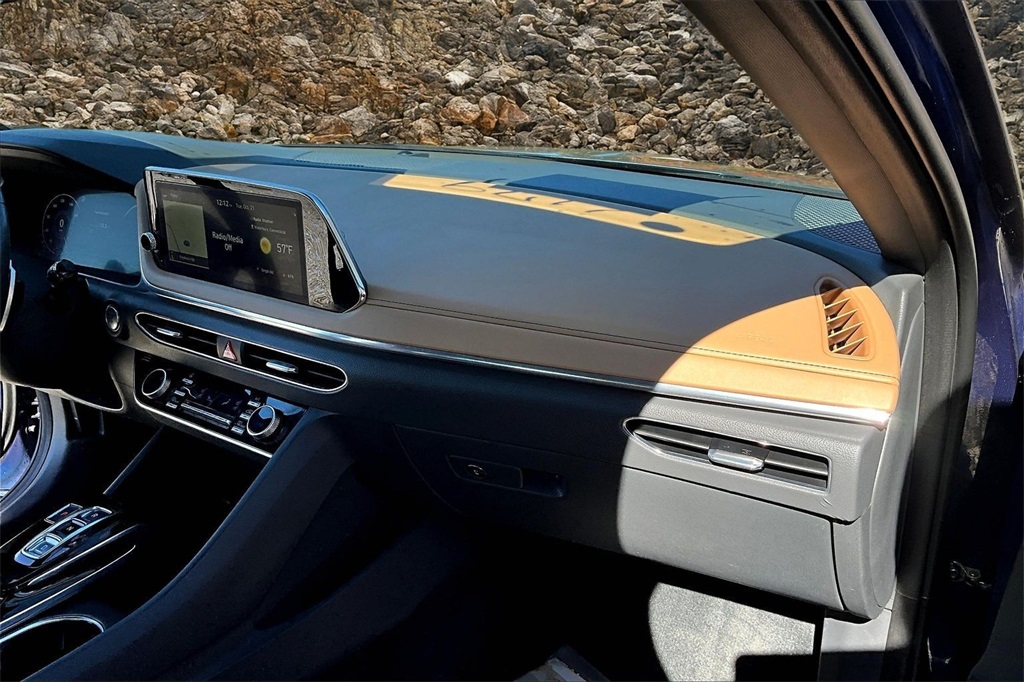 | Navigation System | | Blue Link Connected Care & Remote Package | | Option Group 01 | | 12 Speakers | | AM/FM radio: SiriusXM | | Bose Premium Audio | | Radio data system | | Radio: AM/FM/MP3/HD/SiriusXM Display Audio w/Nav | | Air Conditioning | | Automatic temperature control | | Front dual zone A/C | | Rear window defroster | | Heads-Up Display | | Memory seat | | Power driver seat | | Power steering | | Power windows | | Remote keyless entry | | Steering wheel mounted audio controls | | Four wheel independent suspension | | Speed-sensing steering | | Traction control | | 4-Wheel Disc Brakes | | ABS brakes | | Dual front impact airbags | | Dual front side impact airbags | | Emergency communication system: Blue Link Connected Care (3-year subscription) | | Front anti-roll bar | | Knee airbag | | Low tire pressure warning | | Occupant sensing airbag | | Overhead airbag | | Rear anti-roll bar | | Rear side impact airbag | | Power moonroof | | Brake assist | | Electronic Stability Control | | Auto High-beam Headlights | | Delay-off headlights | | Fully automatic headlights | | Panic alarm | | Security system | | Speed control | | Bumpers: body-color | | Heated door mirrors | | Mud Guards | | Power door mirrors | | Rear Bumper Applique | | Turn signal indicator mirrors | | Apple CarPlay & Android Auto | | Auto-dimming Rear-View mirror | | Carpeted Floor Mats | | Driver door bin | | Driver vanity mirror | | Front reading lights | | Garage door transmitter: HomeLink | | Heated steering wheel | | Heated/Ventilated Front Bucket Seats | | Illuminated entry | | Outside temperature display | | Overhead console | | Passenger vanity mirror | | Rear seat center armrest | | Tachometer | | Telescoping steering wheel | | Tilt steering wheel | | Trip computer | | Wireless Phone Charging | | Front Bucket Seats | | Front Center Armrest | | Heated front seats | | Leather Seating Surfaces | | Power passenger seat | | Split folding rear seat | | Ventilated front seats | | Passenger door bin | | Alloy wheels | | Wheels: 18 x 7.5J Machine/Argent Finish Alum Alloy | | Rain sensing wipers | | Speed-Sensitive Wipers | | Variably intermittent wipers | | Fresh oil change |