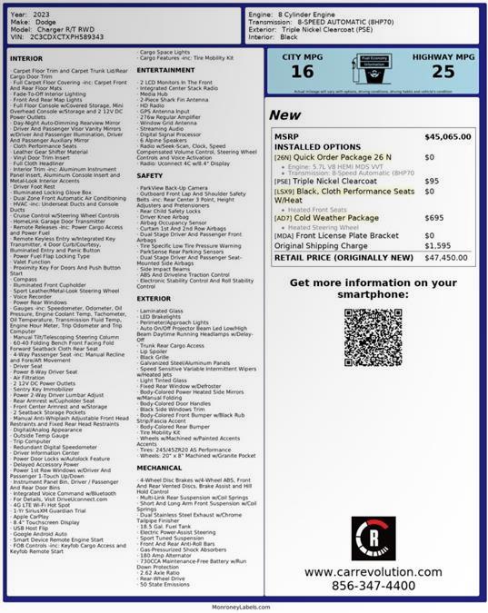 Looking for a clean, well-cared for 2023 Dodge Charger? This is it. This Dodge Charger R/T's level of quality is not meant for just anyone. It's meant for the person who strives for a classy, comfortable, and luxurious car. It's not a misprint. And the odometer isn't broken. This is a very low mileage Dodge Charger. A rare find these days. You've found the one you've been looking for. Your dream car. There is no reason why you shouldn't buy this Dodge Charger R/T. It is incomparable for the price and quality. Car Revolution has been in business since 1998 with 2 locations and over 300 cars. A family owned business, focused and determined to extend hospitality to all our clients. We make every effort to present information that is accurate. However, it is based on data provided by the vehicle manufacturer and other sources. Therefore exact Configuration, Color, Certification and Accessories should be used as a guide only and are not guaranteed under any circumstances, for any inaccuracies, claims of losses of any nature. All advertised prices includes all cost to be paid by the consumer, except: Title, Taxes, Registration, License Fees, Insurance, Dealer Prep, Additional Options and include all applicable rebates. Subject to Credit Approval. Every effort is made in order to display accurate and current vehicle information, including Pricing. All vehicles are subjected to prior sale, removal and transport elsewhere, awaiting Title and Ownership Confirmation. Inventory is updated daily and subject to change. Not responsible for typographical errors or omissions. To better insure the specific vehicle's availability, call us right away at 856-316-3444 and feel free to ask any questions. EMG-WB