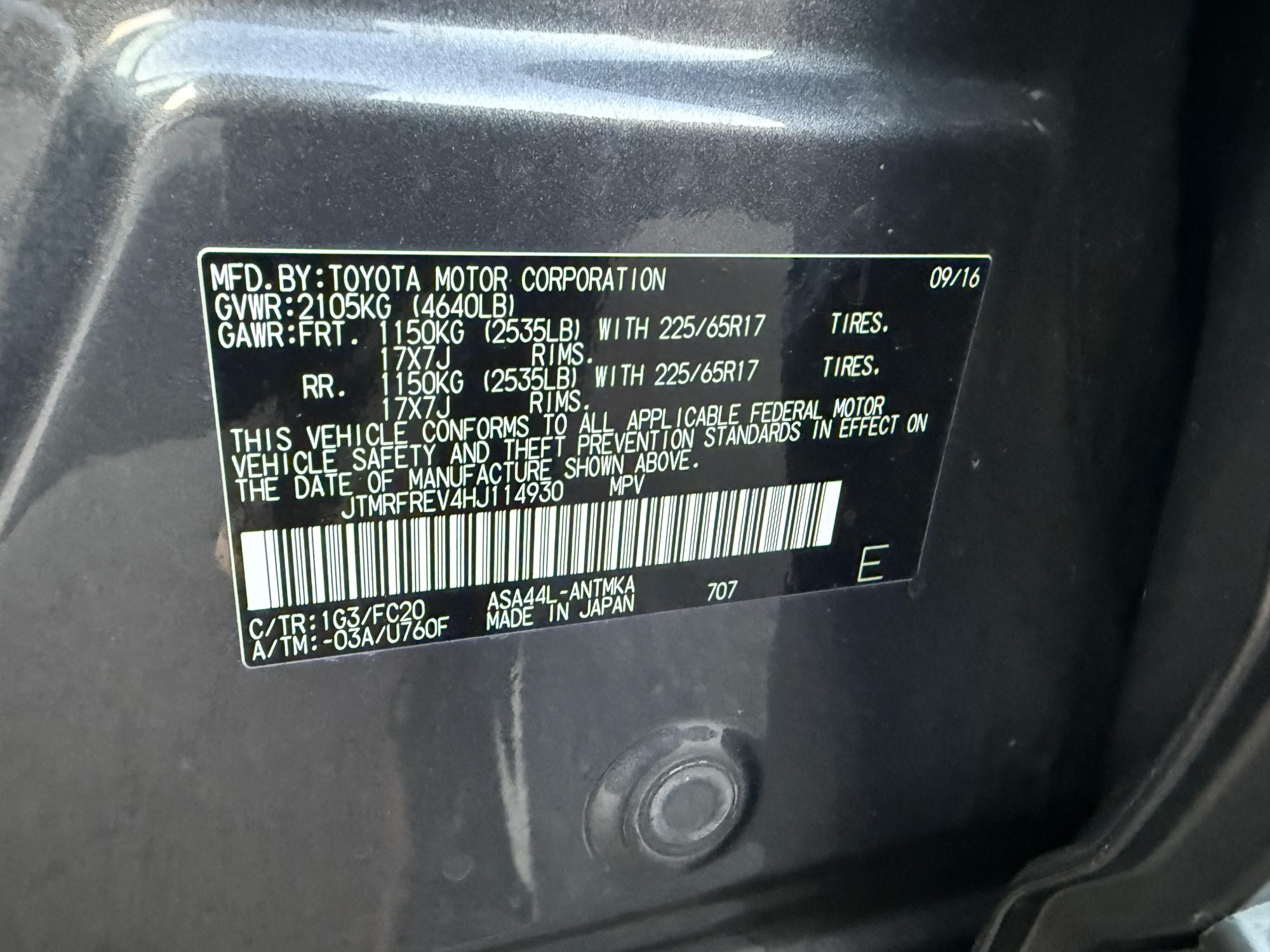 VIN #: JTMRFREV4HJ114930