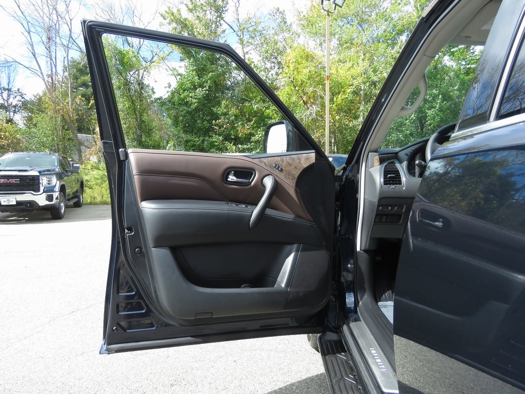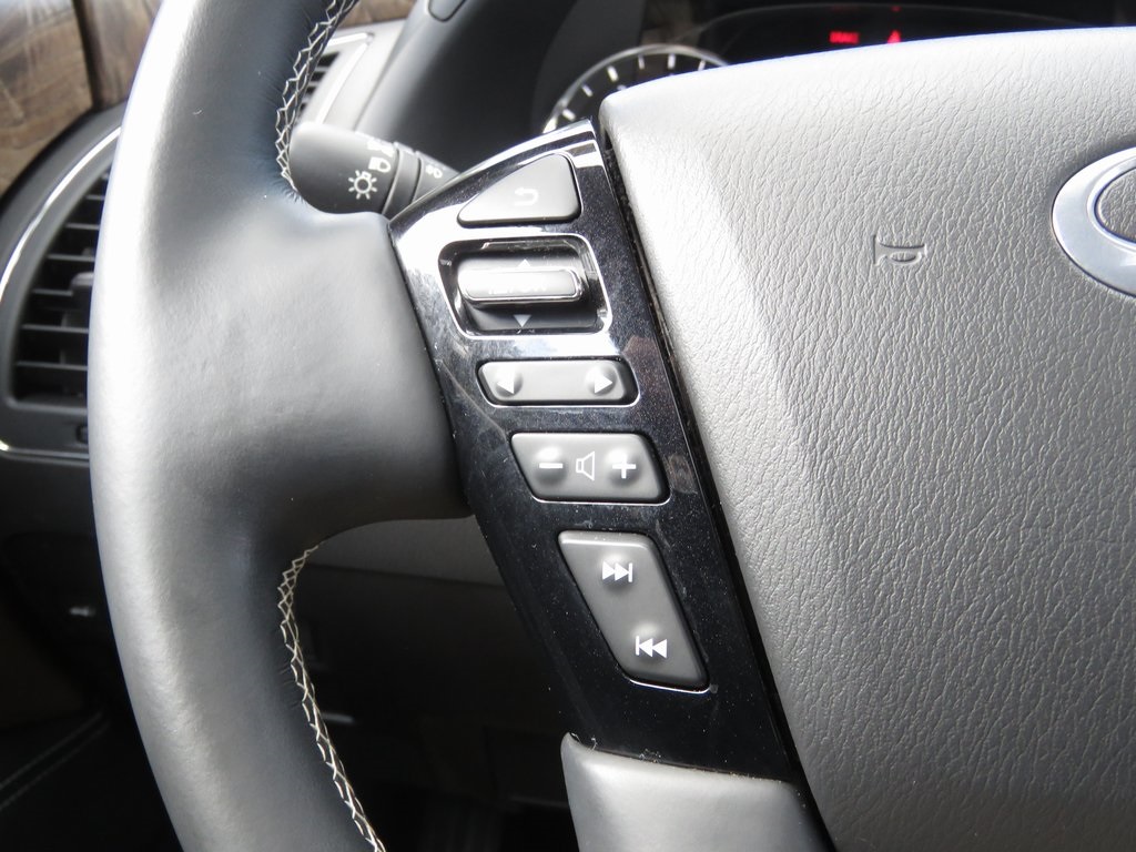 | Navigation system: INFINITI InTouch Navigation | | Cargo Package | | 13 Speakers | | AM/FM radio: SiriusXM | | Radio data system | | Radio: Bose Premium Audio System w/13 Speakers | | Air Conditioning | | Automatic temperature control | | Front dual zone A/C | | Rear air conditioning | | Rear window defroster | | Memory seat | | Power driver seat | | Power steering | | Power windows | | Remote keyless entry | | Steering wheel memory | | Steering wheel mounted audio controls | | Auto-leveling suspension | | Four wheel independent suspension | | Speed-sensing steering | | Traction control | | 4-Wheel Disc Brakes | | ABS brakes | | Anti-whiplash front head restraints | | Dual front impact airbags | | Dual front side impact airbags | | Emergency communication system: INFINITI InTouch | | Front anti-roll bar | | Low tire pressure warning | | Occupant sensing airbag | | Overhead airbag | | Rear anti-roll bar | | Power moonroof | | Power Liftgate | | Brake assist | | Electronic Stability Control | | Auto High-beam Headlights | | Delay-off headlights | | Front fog lights | | Fully automatic headlights | | First-Aid Kit | | Literature Kit | | Panic alarm | | Security system | | Speed control | | Auto-dimming door mirrors | | Bumpers: body-color | | Heated door mirrors | | Power door mirrors | | Spoiler | | Turn signal indicator mirrors | | Apple CarPlay/Android Auto | | Auto tilt-away steering wheel | | Auto-dimming Rear-View mirror | | Compass | | Console Net | | Driver door bin | | Driver vanity mirror | | Front reading lights | | Garage door transmitter: HomeLink | | Heated steering wheel | | Illuminated entry | | Leather Shift Knob | | Leather steering wheel | | Moisture-Resistant Rear Cargo Carpet | | Outside temperature display | | Overhead console | | Passenger vanity mirror | | Premium Select Truffle Brown Interior | | Rear reading lights | | Rear seat center armrest | | Tachometer | | Telescoping steering wheel | | Tilt steering wheel | | Trip computer | | Voltmeter | | 3rd row seats: bench | | Front Bucket Seats | | Front Center Armrest | | Heated Front Bucket Seats | | Heated front seats | | Leather-Appointed Seats | | Power passenger seat | | Reclining 3rd row seat | | Split folding rear seat | | Nylon-Cord Cargo Net | | Passenger door bin | | Roof Rail Cross Bars | | Alloy wheels | | Wheels: 22'' Dark Chrome Cast Aluminum-Alloy | | Rain sensing wipers | | Rear window wiper | | Variably intermittent wipers | | 2.937 Axle Ratio | | ACCIDENT FREE HISTORY REPORT | | EXTENDED WARRANTY AVAILABLE | | FINANCING AVAILABLE |