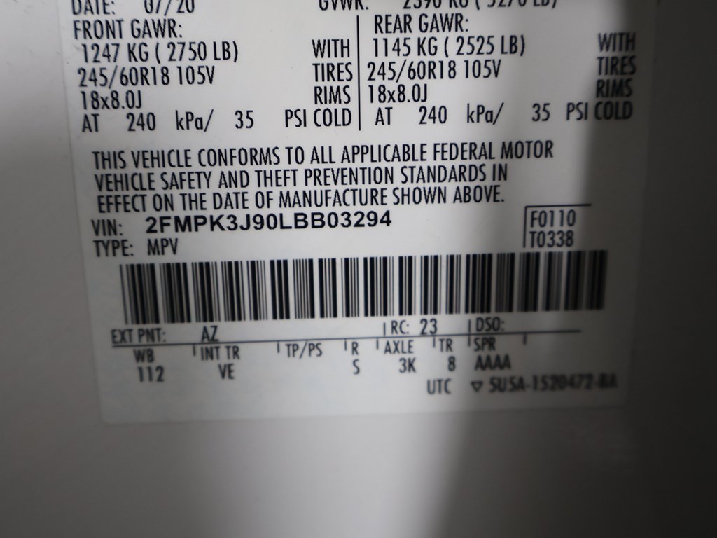 | Equipment Group 201A | | 9 Speakers | | AM/FM radio: SiriusXM | | Premium 9 Speaker Audio System | | Radio: AM/FM Stereo/MP3 Capable | | SiriusXM Radio | | SYNC 3 Communications & Entertainment System | | Air Conditioning | | Automatic temperature control | | Front dual zone A/C | | Rear window defroster | | 110V/150W AC Power Outlet | | Power driver seat | | Power steering | | Power windows | | Remote keyless entry | | Steering wheel mounted audio controls | | Four wheel independent suspension | | Traction control | | 4-Wheel Disc Brakes | | ABS brakes | | Dual front impact airbags | | Dual front side impact airbags | | Emergency communication system: SYNC 3 911 Assist | | FordPass Connect | | Front anti-roll bar | | Knee airbag | | Low tire pressure warning | | Occupant sensing airbag | | Overhead airbag | | Rear anti-roll bar | | Brake assist | | Electronic Stability Control | | Auto High-beam Headlights | | Delay-off headlights | | Front fog lights | | Fully automatic headlights | | Panic alarm | | Perimeter Alarm | | Speed control | | Bumpers: body-color | | Heated door mirrors | | Power door mirrors | | Roof rack: rails only | | Spoiler | | Turn signal indicator mirrors | | ActiveX Seating Material Heated Bucket Seats | | Auto-dimming Rear-View mirror | | Compass | | Driver door bin | | Driver vanity mirror | | Front & Rear Floor Liners | | Front reading lights | | Illuminated entry | | Outside temperature display | | Overhead console | | Passenger vanity mirror | | Rear reading lights | | Rear seat center armrest | | Tachometer | | Telescoping steering wheel | | Tilt steering wheel | | Trip computer | | Universal Garage Door Opener (UGDO) | | Front Bucket Seats | | Heated front seats | | Power passenger seat | | Split folding rear seat | | Front Center Armrest w/Storage | | Passenger door bin | | Alloy wheels | | Wheels: 18'' Sparkle Silver-Painted Aluminum | | Rain sensing wipers | | Rear window wiper | | Speed-Sensitive Wipers | | Variably intermittent wipers | | 3.80 Axle Ratio | | Apple CarPlay/Android Auto | | Back-up camera | | Blind spot warning | | Forward collision alert | | Keyless start | | Lane departure warning | | Lane keep assist | | Rear parking sensors |