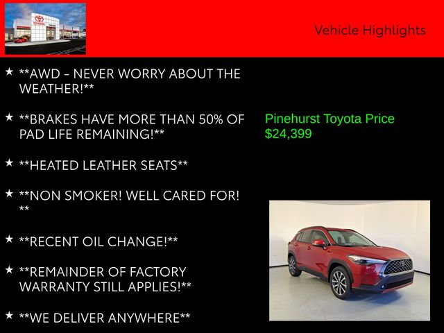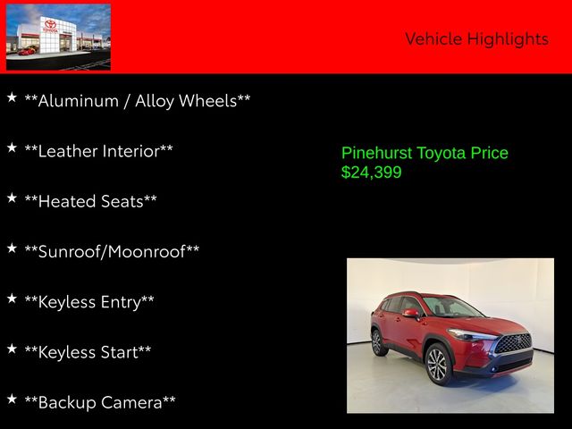 The interior of the Corolla Cross XLE is designed with your comfort and convenience in mind. Featuring a spacious and well-appointed cabin, the XLE model offers premium amenities such as heated leather seats, a sunroof, and a state-of-the-art infotainment system with Apple CarPlay, Android Auto, and Amazon Alexa integration. With ample cargo space and a versatile split-folding rear seat, this SUV is ready to handle all of your life's demands.