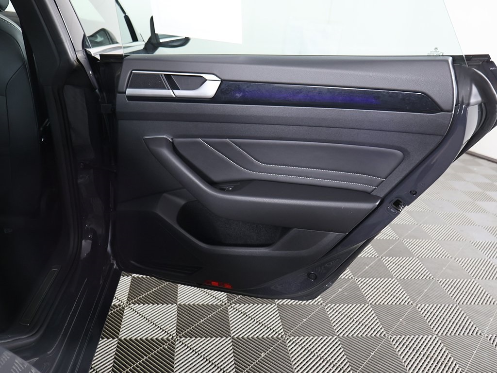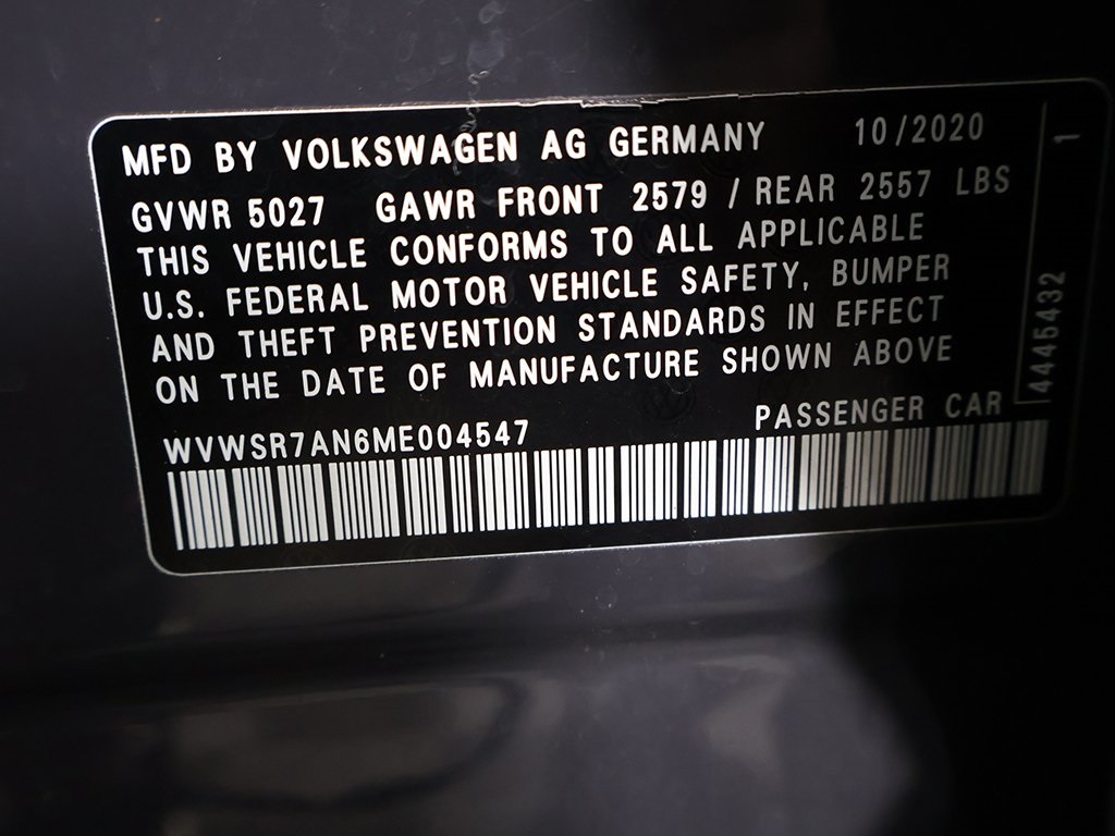 | Navigation System | | 8 Speakers | | AM/FM radio: SiriusXM with 360L | | Radio data system | | Radio: MIB3 Discover Media Navigation AM/FM/HD | | Air Conditioning | | Automatic temperature control | | Front dual zone A/C | | Rear air conditioning | | Rear window defroster | | Memory seat | | Power driver seat | | Power steering | | Power windows | | Remote keyless entry | | Steering wheel mounted audio controls | | Adaptive suspension | | Four wheel independent suspension | | Speed-sensing steering | | Traction control | | 4-Wheel Disc Brakes | | ABS brakes | | Dual front impact airbags | | Dual front side impact airbags | | Emergency communication system: VW Car-Net Safe & Secure 5-year | | Front anti-roll bar | | Knee airbag | | Low tire pressure warning | | Occupant sensing airbag | | Overhead airbag | | Rear anti-roll bar | | Brake assist | | Electronic Stability Control | | Exterior Parking Camera Rear | | Auto High-beam Headlights | | Delay-off headlights | | Front fog lights | | Fully automatic headlights | | First Aid Kit | | Panic alarm | | Security system | | Speed control | | Auto-dimming door mirrors | | Bumperdillo Protection Plate for Rear Bumper | | Bumpers: body-color | | Heated door mirrors | | Power door mirrors | | Spoiler | | Turn signal indicator mirrors | | Auto-dimming Rear-View mirror | | Compass | | Driver door bin | | Driver vanity mirror | | Front reading lights | | Heated Front Comfort Sport Seats | | Illuminated entry | | Leather Shift Knob | | Leather steering wheel | | Outside temperature display | | Overhead console | | Passenger vanity mirror | | Rear reading lights | | Rear seat center armrest | | Roadside Assistance Kit | | Rubber Mats Kit | | Sport steering wheel | | Tachometer | | Telescoping steering wheel | | Tilt steering wheel | | Trip computer | | Volkswagen Logo Puddle Lights | | Front Bucket Seats | | Front Center Armrest | | Heated front seats | | Perforated Nappa Leather Seating Surfaces | | Power passenger seat | | Split folding rear seat | | Passenger door bin | | Alloy wheels | | Wheels: 19'' 2-Tone Machined Alloy | | Rain sensing wipers | | Variably intermittent wipers | | Adaptive cruise control | | Apple CarPlay/Android Auto | | Blind spot warning | | Forward collision alert | | Keyless start | | Lane departure warning | | Lane keep assist | | Power folding side-view mirrors | | Panoramic sunroof | | Front & Rear Parking Sensors | | IQ.DRIVE | | Travel Assist | | Digital Cockpit | | Remote start | | Wireless charger |