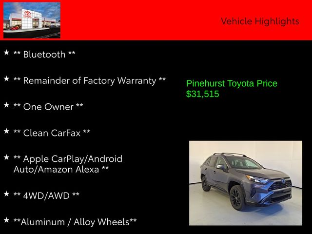 As a Toyota Gold Certified pre-owned vehicle, this RAV4 Hybrid SE has undergone a rigorous 160-point inspection and comes with a comprehensive warranty package, including a 12-month/12,000-mile limited comprehensive warranty, an 84-month/100,000-mile powertrain limited warranty, and 7 years/100,000 miles of roadside assistance. You can purchase with confidence, knowing that this SUV has been meticulously maintained and is backed by Toyota's renowned reliability.
