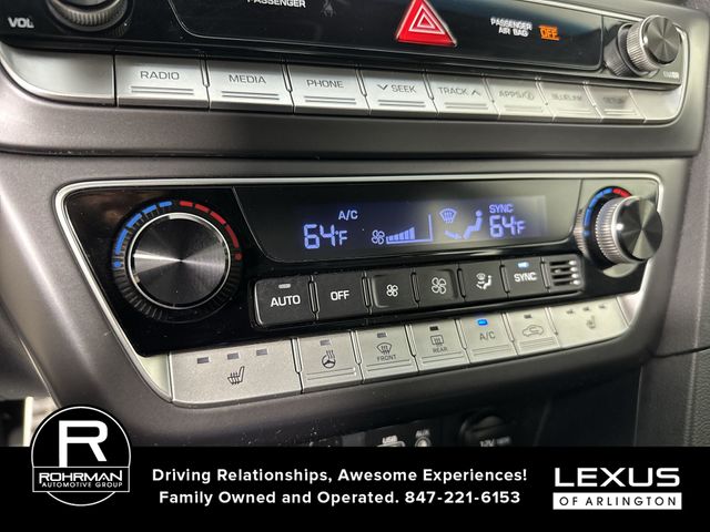 | Option Group 01 | | 6 Speakers | | AM/FM radio: SiriusXM | | Radio data system | | Radio: AM/FM/HD/SiriusXM/MP3 Display Audio | | Air Conditioning | | Automatic temperature control | | Front dual zone A/C | | Rear window defroster | | Power driver seat | | Power steering | | Power windows | | Remote keyless entry | | Steering wheel mounted audio controls | | Four wheel independent suspension | | Speed-sensing steering | | Traction control | | 4-Wheel Disc Brakes | | ABS brakes | | Dual front impact airbags | | Dual front side impact airbags | | Emergency communication system: Blue Link | | Front anti-roll bar | | Knee airbag | | Low tire pressure warning | | Occupant sensing airbag | | Overhead airbag | | Rear anti-roll bar | | Power moonroof | | Brake assist | | Electronic Stability Control | | Exterior Parking Camera Rear | | Auto High-beam Headlights | | Delay-off headlights | | Fully automatic headlights | | Panic alarm | | Security system | | Speed control | | Bumpers: body-color | | Heated door mirrors | | Power door mirrors | | Rear Bumper Applique | | Turn signal indicator mirrors | | Apple CarPlay & Android Auto | | Carpeted Floor Mats | | Driver door bin | | Driver vanity mirror | | Front reading lights | | Heated steering wheel | | Illuminated entry | | Leather Shift Knob | | Leather steering wheel | | Outside temperature display | | Overhead console | | Passenger vanity mirror | | Rear seat center armrest | | Sport steering wheel | | Tachometer | | Telescoping steering wheel | | Tilt steering wheel | | Trip computer | | Front Bucket Seats | | Front Center Armrest | | Heated front seats | | Heated Front Sport Seats | | Leather Bolster/Cloth Insert Seating Surfaces | | Split folding rear seat | | Passenger door bin | | Reversible Cargo Tray | | Alloy wheels | | Wheels: 17 x 7.0J Aluminum Alloy | | Speed-Sensitive Wipers | | Variably intermittent wipers | | Automatic | | Backup Camera | | BlindSpot Detection | | Bluetooth | | Heated Seats | | Keyless Entry | | KEYLESS START | | SUNROOF / PANORAMIC ROOF | | USB Port |