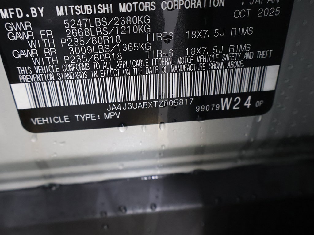 Forward collision alert, Keyless start, 18'' Alloy Wheels, 3rd row seats: split-bench, Accessory Scuff Plates, Android Auto & Apple CarPlay, Auto High-beam Headlights, Automatic temperature control, Blind Spot Warning, Exterior Parking Camera Rear, Front dual zone A/C, Fully automatic headlights, Navigation System, Rear Parking Sensors, 4-Wheel Disc Brakes, 8 Speakers, ABS brakes, Air Conditioning, Alloy wheels, AM/FM radio: SiriusXM, Auto-dimming Rear-View mirror, Brake assist, Bumpers: body-color, Cloth Fabric Seating Surfaces, Driver door bin, Driver vanity mirror, Dual front impact airbags, Dual front side impact airbags, Electronic Stability Control, Emergency communication system: Mitsubishi Connect w/ 24-month trial, Four wheel independent suspension, Front anti-roll bar, Front Bucket Seats, Front Center Armrest w/Storage, Front reading lights, Illuminated entry, Knee airbag, Low tire pressure warning, Occupant sensing airbag, Outside temperature display, Overhead airbag, Overhead console, Panic alarm, Passenger door bin, Passenger vanity mirror, Power door mirrors, Power steering, Power windows, Radio data system, Radio: AM/FM 12.3'' Navigation w/Smartphone-Link, Rear anti-roll bar, Rear seat center armrest, Rear side impact airbag, Rear window defroster, Rear window wiper, Reclining 3rd row seat, Remote keyless entry, Security system, Speed control, Speed-Sensitive Wipers, Split folding rear seat, Spoiler, Steering wheel mounted audio controls, Tachometer, Telescoping steering wheel, Tilt steering wheel, Traction control, Trip computer, Turn signal indicator mirrors, Variably intermittent wipers, Dynamic Sound Yamaha Premium, Google Built-In Services, 18'' Alloy Wheels, 3rd row seats: split-bench, Accessory Scuff Plates, Android Auto & Apple CarPlay, Auto High-beam Headlights, Automatic temperature control, Blind Spot Warning, Exterior Parking Camera Rear, Front dual zone A/C, Fully automatic headlights, Navigation System, Rear Parking Sensors. Price includes: $500 - Customer Cash. Exp. 02/02/2026