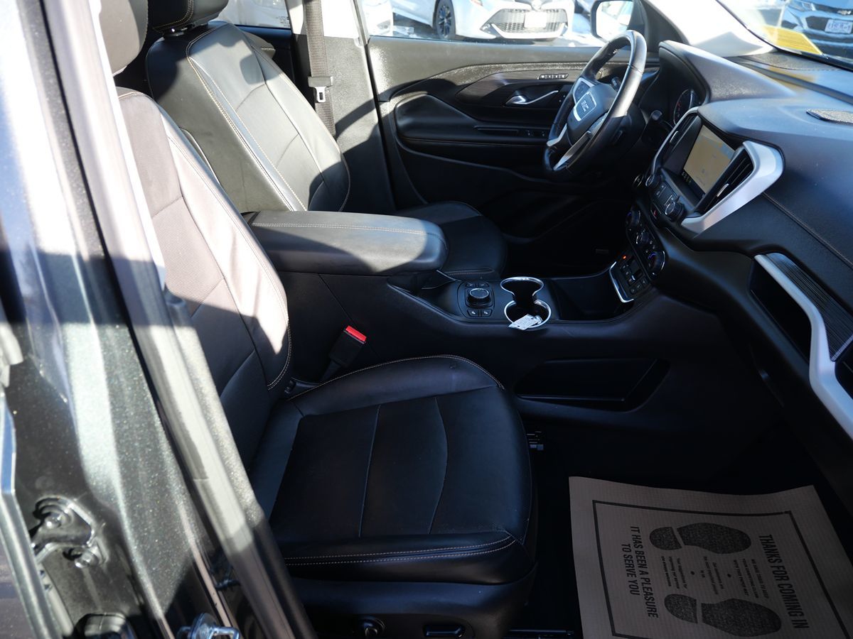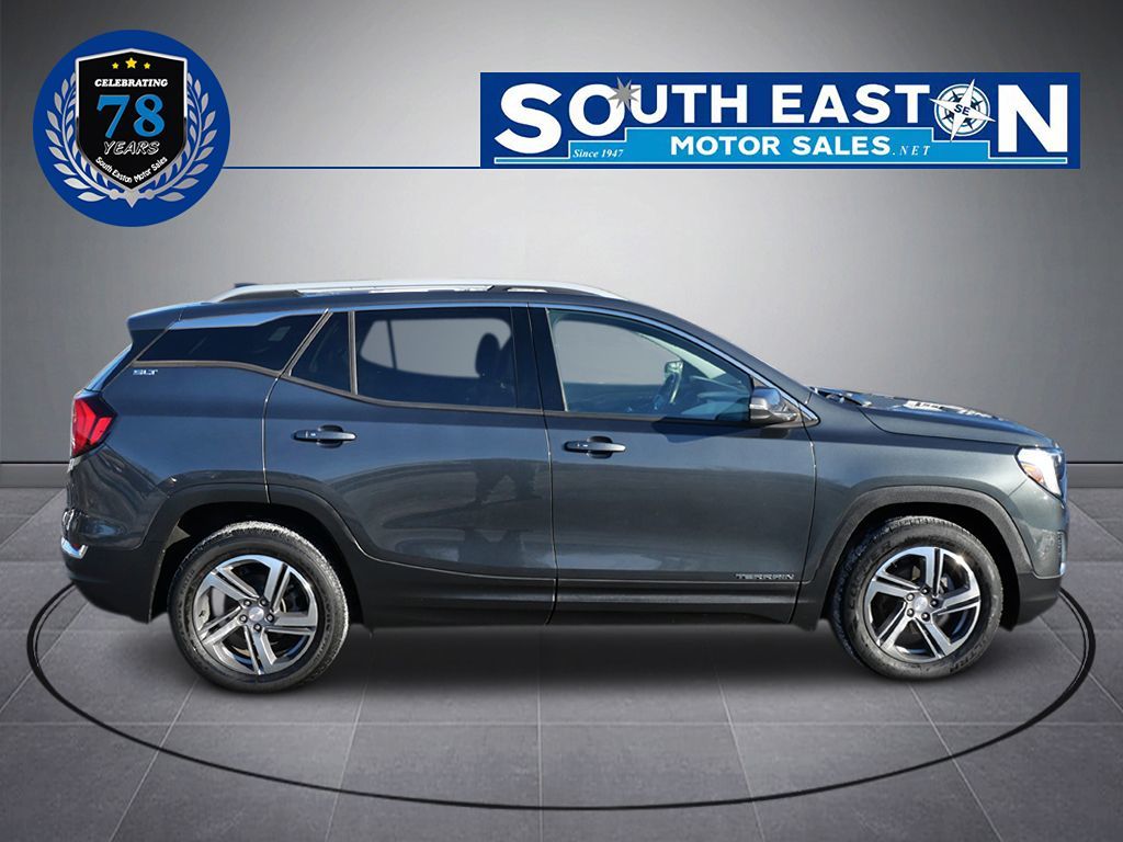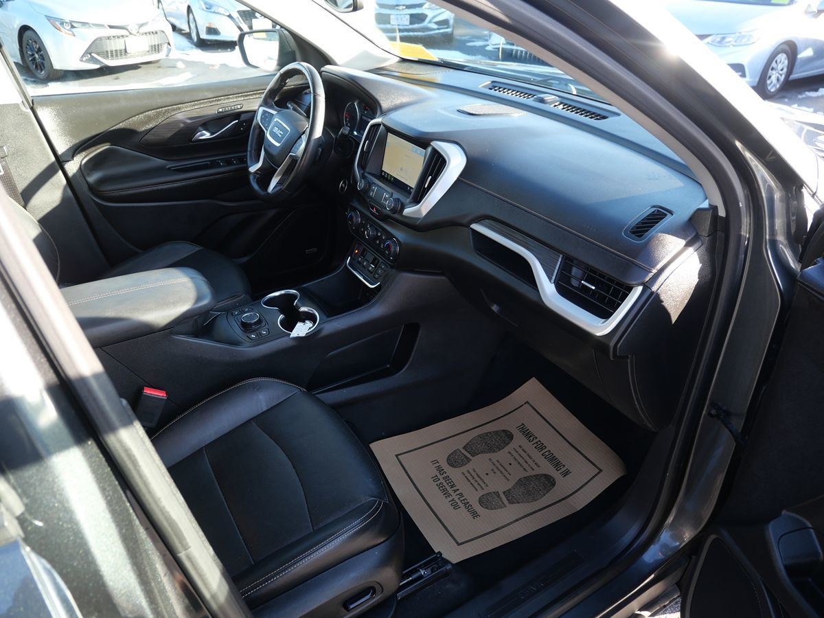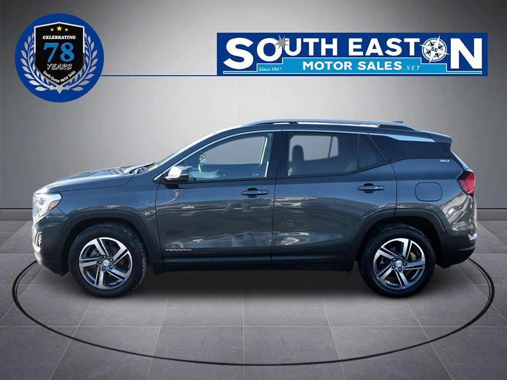 The 2019 GMC Terrain AWD 4dr SLT, adorned in a sophisticated Graphite Gray Metallic exterior and complemented by a sleek Jet Black interior, exudes elegance and functionality. At its heart lies a robust 1.5L 4-cylinder engine, designed for both efficiency and performance. Enhanced with an available upgrade to a 2.0L Turbo 4-cylinder SIDI VVT engine, it delivers a balance of power and economy, ensuring a smooth ride through every journey. Equipped with advanced features such as blind spot monitoring and parking assist, the Terrain prioritizes safety and ease of navigation. The inclusion of heated seats and a premium sound system ensures a comfortable and enjoyable ride, while the hands-free and power liftgate adds a touch of convenience to daily errands. The towing package and all-wheel drive drivetrain make it ready for any adventure, from city streets to rugged terrain. With added luxury touches like a moonroof and the Skyscape power sunroof with a power sunscreen, the Terrain invites natural light and fresh air into the cabin. The preferred package, which includes navigation and remote start, enhances the driving experience, while the rear seat infotainment system, available with or without a DVD player, keeps passengers entertained on longer travels. This versatile SUV, embraced by its innovative features and stylish design, stands as a testament to GMC's commitment to quality and versatility.