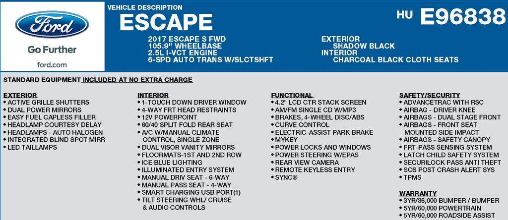 Whether you're navigating the city streets or exploring the open road, this 2017 Ford Escape S is the perfect companion. With its impressive fuel efficiency, versatile cargo space, and advanced technology features, it's the complete package for the modern driver.