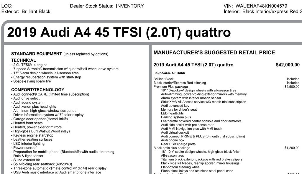 This 2019 Audi A4 2.0T Premium Plus QUATTRO is a true standout in its class, offering a winning combination of style, performance, and technology. With low mileage and an extensive list of premium features, this vehicle is an exceptional value.