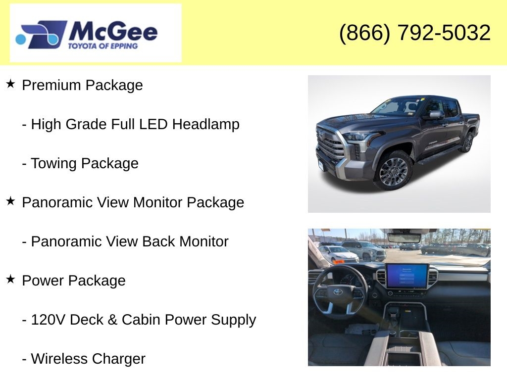 Recent Arrival! FANTASTIC SERVICE HISTORY!, ONE OWNER, BRAND NEW CABIN AIR FILTER, BRAND NEW ENGINE AIR FILTER, FRESH ENGINE OIL & FILTER, INSTALLED BOTH FRONT WIPER BLADES, ROTATED & BALANCED ALL TIRES, BRAND NEW FRONT BRAKE ROTORS AND BRAKE PADS, BRAND NEW REAR BRAKE ROTORS AND BRAKE PADS, TIRES ARE VERY GOOD MEASURING 7/32-8/32, WE SPENT $2,011.69 THROUGH OUR PROFESSIONAL SHOP TO MAKE THIS VEHICLE FRONTLINE READY FOR SALE INVESTING IN SAFETY, QUALITY, AND PEACE OF MIND FOR THE NEXT OWNER., 4WD, Black w/Leather Seat Trim, 120V Deck & Cabin Power Supply, Heated front seats, Heated Leather Steering Wheel, High Grade Full LED Headlamp, JBL Premium Audio, Panoramic View Back Monitor, Panoramic View Monitor Package, Power Package, Power Tilt/Slide Panoramic Sunroof, Premium Package, Ventilated front seats, Wireless Charger. At McGee Toyota Of Epping we want you to know that all our vehicles are priced at a competitive value position to the market. We use an independent 3rd party software to research internet listings on all vehicles in the market so we can ensure that our prices are the most competitive out there. We do this simply so people choose us when they start searching for their next car. CARFAX One-Owner. 2023 Toyota Tundra Limited 4D CrewMax Magnetic Gray Metallic 4WD 10-Speed Automatic 3.4L V6 McGee Toyota is a Family-Owned Business and we enjoy assisting all of our guests buying their next vehicle!