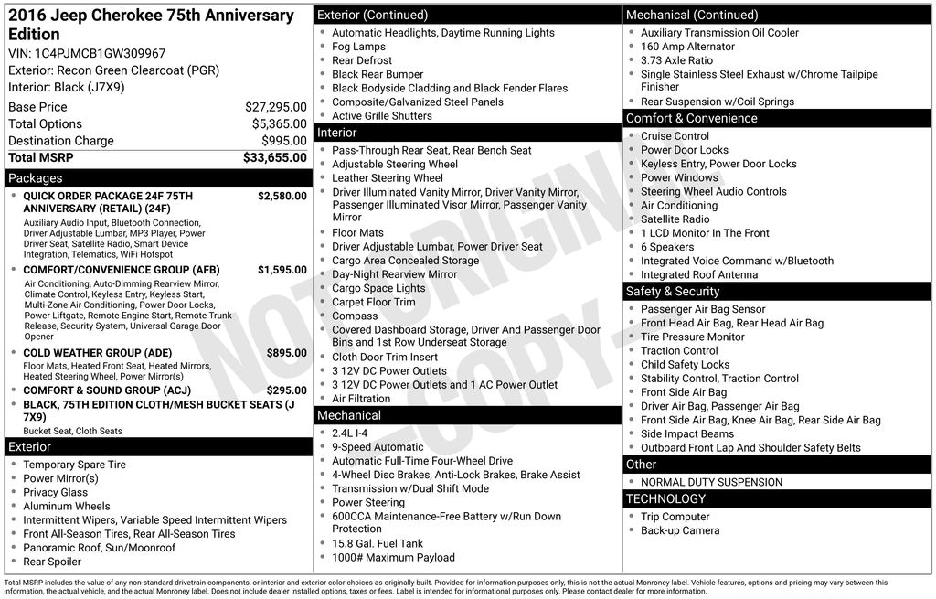 Recent Arrival! 2016 Recon Green Clearcoat Jeep Cherokee 75th Anniversary Edition 4WD This Jeep Cherokee has many features and is well equipped including. Sunroof / Moonroof, Heated Seats, Heated Steering Wheel, Backup Camera, Collision Warning System, Keyless Access with Push Button Start, 1-Year SiriusXM Radio Service, 6 Month Trial (Registration Required), 75th Anniversary Badge, 75th Edition Cloth/Mesh Bucket Seats, 8.4'' Touchscreen Display, 9 Amplified Speakers w/Subwoofer, Air Conditioning ATC w/Dual Zone Control, All-Season Floor Mats, Bronze Fascia Applique, Bronze Grille Surrounds, Bronze Roof Rails, Cargo Net, Cold Weather Group, Comfort & Sound Group, Comfort/Convenience Group, Day Light Opening Moldings, Engine Block Heater, Exterior Mirrors w/Heating Element, For More Info Call 800-643-2112, GPS Antenna Input, Heated Front Seats, Heated Steering Wheel, Humidity Sensor, Integrated Voice Command w/Bluetooth, Jeep 75th Anniversary Package, Jeep Bronze Badging, Nav Capable! See Dealer For Details, No Satellite Coverage w/AK/HI, Passive Entry/Keyless Go, Power 4-Way Driver Lumbar Adjust, Power 8-Way Driver Seat, Power Front/Fixed Rear Full Sunroof, Power Heated Mirrors, Power Liftgate, Premium Air Filter, Quick Order Package 24F 75th Anniversary (Retail), Radio: Uconnect 8.4, Rear-View Auto-Dimming Mirror w/Microphone, Remote Proximity Keyless Entry, Remote Start System, Remote USB Port, Security Alarm, SIRIUSXM Satellite Radio, Tangerine Interior Accents, Uconnect Access, Universal Garage Door Opener, Wheels: 18'' x 7'' Bronze Painted Aluminum, Windshield Wiper De-Icer.