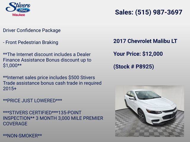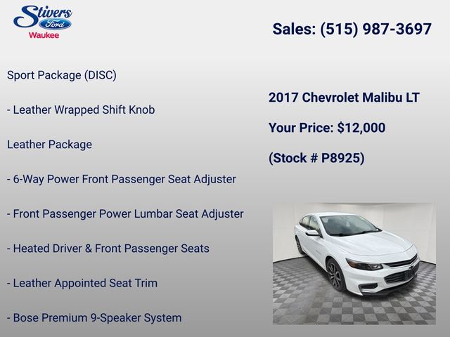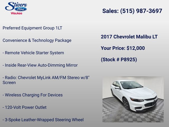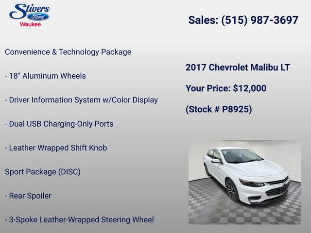 Don't miss out on the opportunity to own this exceptional 2017 Chevrolet Malibu LT 1LT. Visit our showroom today and experience the quality, performance, and value that this Malibu has to offer.
